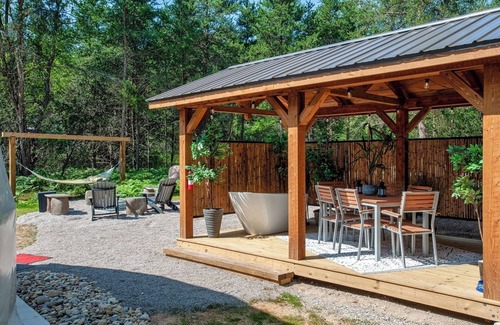 Outside you will find a second bathtub. This outdoor bathtub is private and positioned so you can enjoy a relaxing bath while listening to the soothing sounds of nature. In addition, there is a private firepit, barbeque, and hammock. We provide one complimentary bundle of firewood for each day booked.