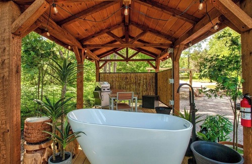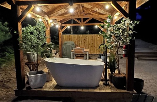 Outside you will find a second bathtub under a beautifully decorated gazebo. This outdoor bathtub is private and positioned so you can enjoy a relaxing bath while listening to the soothing sounds of nature.