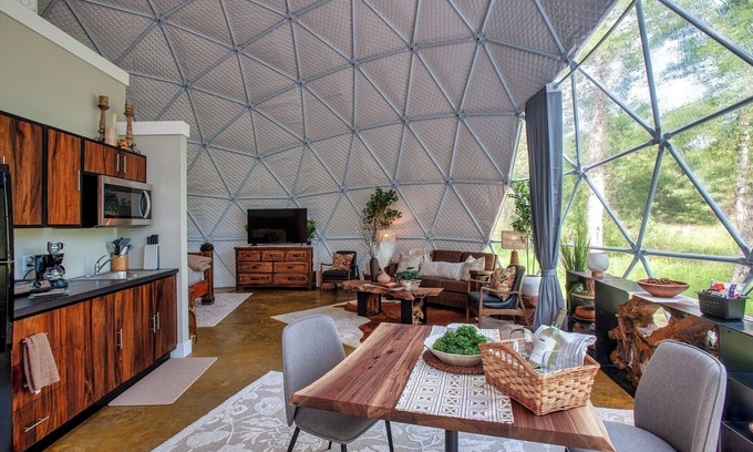 Geodesic Dome Home #15 sleeps two and features a massive, handcrafted king-size barnwood bed. The interior of the dome is open and spacious with 850 square feet of living space - that's almost 3x the size of a hotel room. The 18' tall ceiling contributes to an ambiance that is difficult to adequately describe other than "amazing." The living room area has a full-size sofa and a coffee table. There is a dining table and chairs. Should it rain, there is a TV to stream your favorite movie. There is a private, indoor bathroom and kitchen. The kitchen has a full-size refrigerator and an electric double-burner countertop stove. The bathroom has a full-size tub and shower.