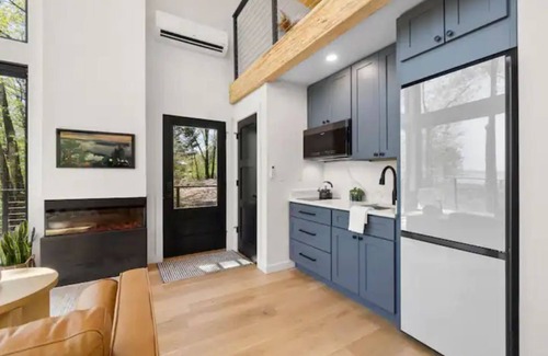 Inside you will find 20' floor to ceiling windows which makes you feel you're outside among the trees. The kitchenette offers a two burner cook top and microwave for your cooking needs. Quartz counters and back splash, with sleek modern appliances. The kitchen is stocked with dishes, cookware and utensils needed for your stay. We do provide salt and pepper, as well as cooking spray. In the dining area you will find a table that seats four that overlooks the patio and views of the Lake. There is also a washer and dryer provided for the guests during their stay.