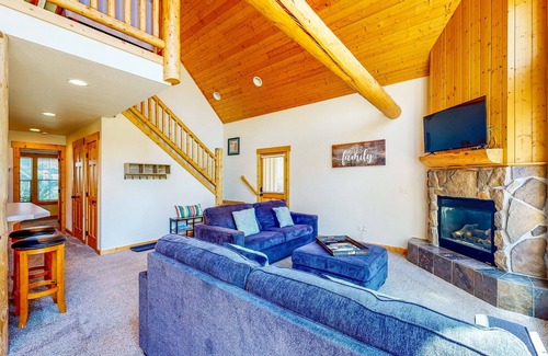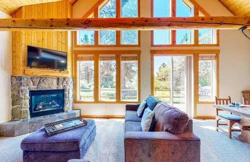 Inside, find yourself relaxing on the comfortable seating in the living room, tuned into your favorite TV show (Apple TV provided), and warmed by the heat of the fireplace. The adjacent well-equipped kitchen presents a pleasant space to whip up culinary creations, and when you're ready to eat, dine family-style at the large dining table.