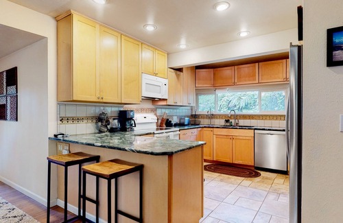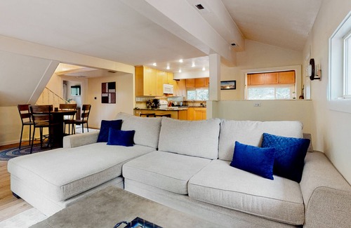 Inside, comfort meets convenience. The open living room features a soft sofa, a large TV, and a wood-burning fireplace. The adjacent full kitchen comes fully prepared for your culinary ventures with its suite of stainless steel appliances and ample meal prep space. Off the kitchen, appreciate having access to a private washer/dryer.