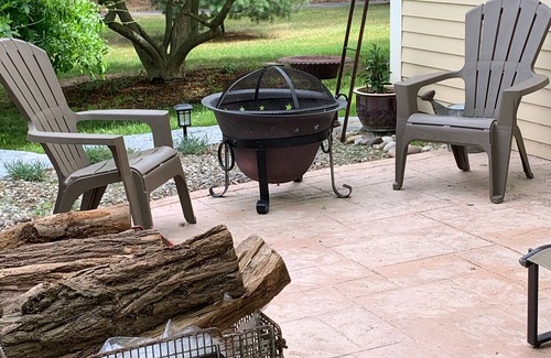 Outside on the spacious patio that wraps around to the side of the house will be a medium size propane grill, patio table and chairs, two lounge chairs and a couple Adirondack chairs to enjoy the evening by the fire pit with the provided firewood, kindling and fire starters.
