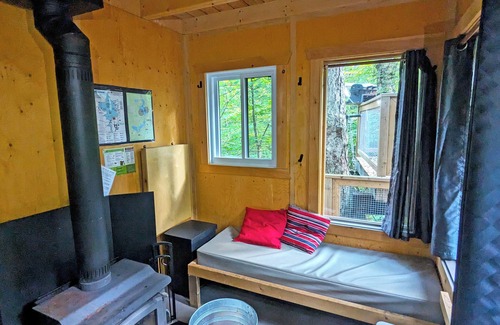 The treehouses are well equipped so you don’t have to bring much. YOU WILL TRANSPORT YOUR OWN BAGGAGE ON A HIKING TRAIL, A DISTANCE OF 200-1000 METERS (12-20 minutes). We provide 2 carts per treehouse. Each treehouse has access to 1 small cart and 1 large cart in summer OR 2 large toboggans in winter. Backpacks make transport easier. Wear appropriate footwear. Canoes are available for rent, and can be used for transport of baggage (Lakeside East only), 8 minutes paddling.