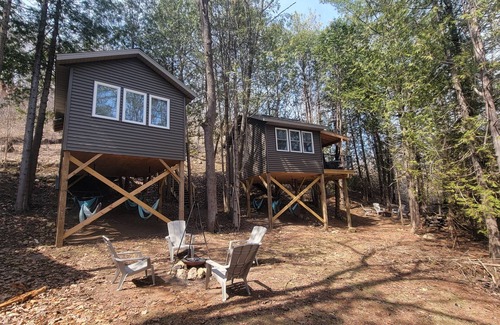 Enjoy driftless woodland valley views from this "reimagined rustic", one-room, 12 by 16 foot cabin on posts in the trees. Perfect for guests looking for a camping / glamping experience but prefer lodging accommodations. Linens and towels provided. Corner bunk with 3 twin mattresses. Couch converts to a full bed. Heat, A/C, wi-fi, mini fridge, microwave and coffee pot. Hanging hammock chairs outside underneath the cabin. Private firepit with cooking grate and 4 chairs. Shared outdoor seating areas and gas grill. Cabin does not have plumbing. Year-round heated bathhouse with hot water, showers, toilets and drinking water available within 50 feet. Hiking trail and woodland areas to explore on the 14-acre property. Firewood is available for purchase on site.This unit is one of three treehouse cabins available on the property.