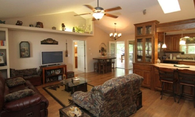Tree House Hideaway is the perfect description for this amazing upscale vacation rental. The view from the bright sunroom and spacious back deck makes you feel like you are living up in the trees!