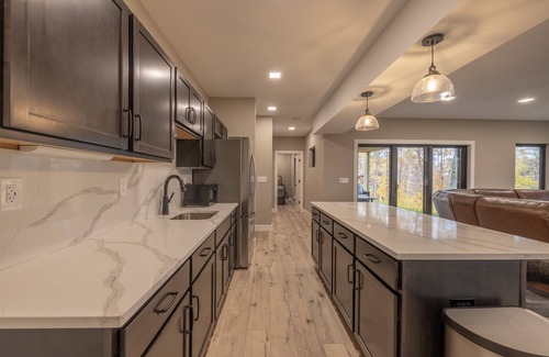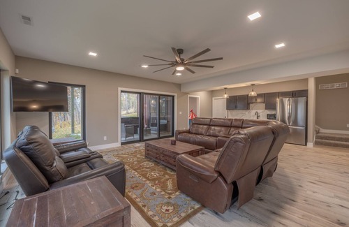 Highlighted by a wall of floor to ceiling windows, this 5-bedroom, 4-bathroom treehouse overlooks the valley below and provides panoramic views of the entire Innsbrook Resort property from afar. Able to accommodate 13 guests comfortably, the stunning open floor plan features a stone-wall fireplace, luxury furniture, separate dining table for 6 guests, fully equipped kitchen with quartz countertops, stainless steel appliances, soft-close cabinets, and much more! Modern light fixtures, ceramic tiled bathrooms and laminate flooring throughout are just a few of the special features that make this newly constructed treehouse unique.