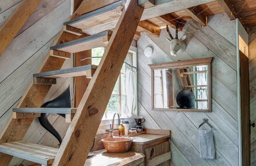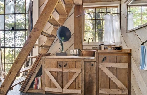 This rustic and refined treehouse provides a comfortable treetop retreat. Part glamping, part boutique hotel, your climate controlled hideaway is complete with a bathroom and kitchenette up in the trees.