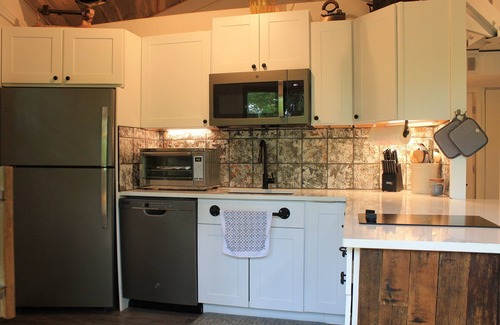 This two bedroom, two bath cabin has been completely renovated and furnished with items that reflect the woodland surroundings. It is a circular cabin completely surrounded in walls of windows with privacy blinds. This is one of the few Treetop cabins with a king Bed. In the other bedroom you will find a comfortable queen bed. The kitchen has new fixtures, cabinets and appliances. Both of the bathrooms are tastefully tiled in natural stone and have new fixtures. The master bathroom has a traditional shower and a rain shower head. There is a 42 inch smart tv in the living room with 50 channels, high speed internet and WI-FI. There is also a 42 inch TV in the master bedroom. Walk outside to find a furnished patio to enjoy the beautiful mountains under a canopy of trees. The cabin comes with complimentary coffee for the traditional coffee maker. The kitchen has all the items needed to cook breakfast lunch or dinner. A roll-away bed is also available upon request for an additional guest. There is a Weber propane grill located on the outside deck. There is a laundry room downstairs, which is has detergent to wash your laundry if needed.