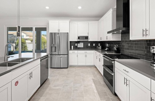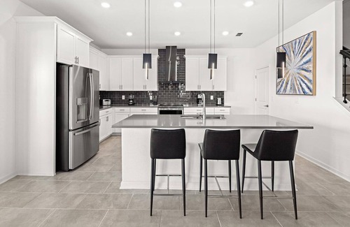 KITCHEN: The sparkling black-and-white kitchen, stocked with essential culinary gear and gadgets, is a chef’s dream. While dinner simmers, lounge at the kitchen island with stools, lit by chic modern accent lighting.