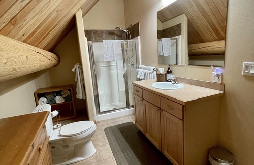 Logos Lodge is a tri-level, open beam, mountain home on a hillside above a quiet road into the Timberline neighborhood about 3 miles east of Packwood. Exposed log posts and beams, log bed frames, plus evergreen views in every direction add to the ski lodge theme. The lodge's tri-level floor plan is ideal for a multi family getaway. A large fully equipped kitchen is adjacent to a 10 seat dining table. The 325 sqf outdoor deck on the Main Level has seating, table, gas grill, and propane fire table. The Loft has a comfy leather sectional, smart HD TV, work table, and DVD player. Besides a sleeping area with a bunk and two single beds, the lower level has a 32” and a 65" smart HD TVs, air hokey table, foosball, Star Wars digital pinball, Fast & the Furious arcade racing game, and equipment storage rack near the exit door. Warm up by our outdoor fire pit. Only a quarter mile from Highway 12, Logos Lodge is a comfortable and convenient launch pad for your families Northwest adventures.