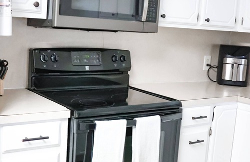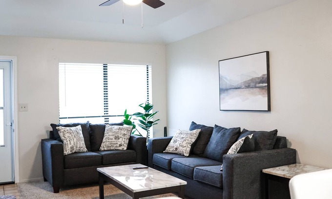 This inviting two-bedroom, one-bath townhome is located in the heart of Hobbs, offering a relaxing stay whether you're here for a short or long-term visit. The living room has a cozy fireplace and comfortable couches where you can unwind and watch your favorite shows on the 65” Smart TV. You'll love the location, as it's within walking distance of several restaurant options, including Chili’s, Applebee’s, Starbucks, Schlotzsky’s, and more making it a great location