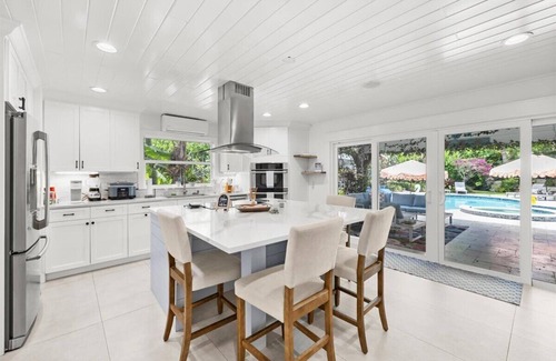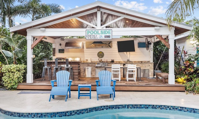 Welcome to the "Trophy Fish," a private oasis where resort-style living meets relaxation and fun. Set on a lush half-acre, this retreat offers an in-ground pool and spa, fully equipped outdoor kitchen, putt-putt golf, cornhole, a fire pit, and a 120" projector screen for movie nights under the stars. Sonos speakers set the perfect soundtrack inside and out. 4 bedrooms, 3 full baths including the outdoor bathroom and shower.