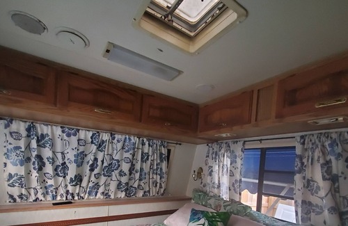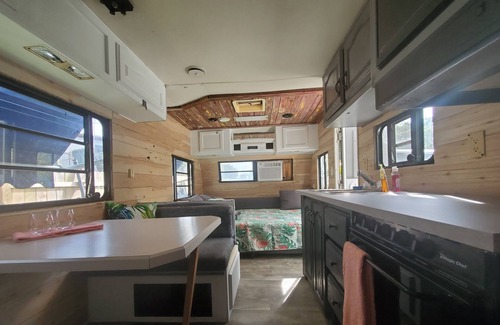 It's and older rv that we have updated. It has new vinyl floors, fresh paint, new countertops, updated kitchen, shiplap on the walls, a new toilet, new decoration, new bedding etc. The kitchen includes a sink, fridge, microwave, freezer and a cooktop burner, new Ac. New curtains/blinds throughout and some new light fixtures.