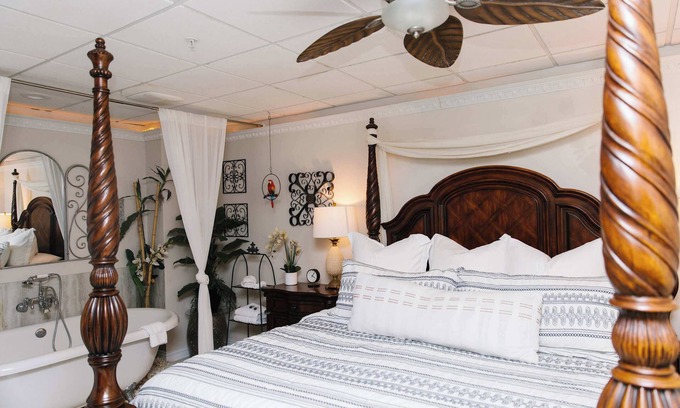 🏨💕 Suite for 2, perfect for honeymoons or romantic getaways! Tropical jungle themed room, our largest suite, real sand, lighting features, king bed (soft comfort bed), fireplace, extra-large two person spa tub with hand shower, Apple TV (flat screen).