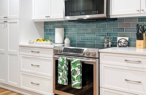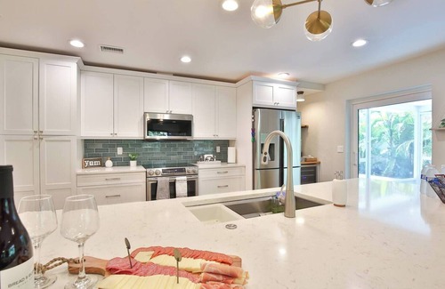 A stunning space with a waterfall island, stainless steel appliances, wine cooler, ice maker, and a fully stocked coffee bar. Perfect for everything from big breakfasts to beach-day picnics.