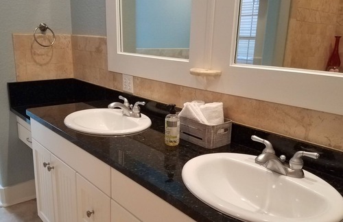 The master bath includes luxury fixtures with granite vanities, a walk-in closet, a Jacuzzi tub, and a separate walk-in shower. The suite has a spacious king size bed with fine bedding. Just off the master bedroom is the living room which offers a brand new couch and comfy chair.