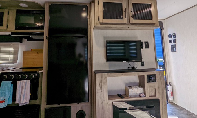 Brand new Cherokee alpha wolf with all the creature comforts. This camper has been fully modified to be a true Fourseason rental. This beautiful new travel trailer comes with one super slide, slide-out on the driver's side. A full kitchen with a residential fridge, three burner stoves, microwave, and air fryer, queen bed in the front, two full-size bunk beds in the back, dinette conversion, and sofa conversion. This camper has plenty of storage space, including under the bed in the tunnel, a walk-in pantry, plenty of drawers, as well as a fold-down storage rack on the back of the trailer. Solar is installed on the roof, keeping the batteries fully charged and running everything except for the air conditioning. Roof-mounted air conditioning with ducts throughout the camper keeps it at the perfect temperature everywhere. Includes fireplace for heat and flatscreen TV, which could be mounted inside or outside under the awning. Includes outside cooktop with burner, icemaker, and fridge.