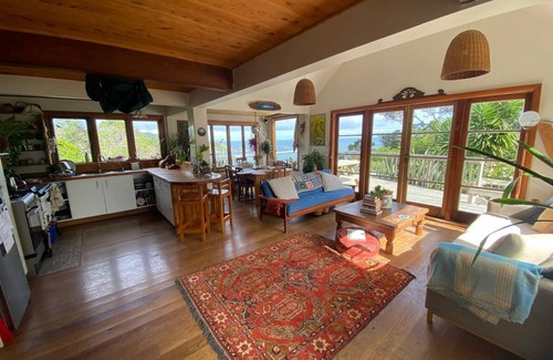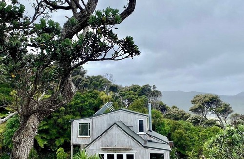 Perched on the top of a hill in the heart of Tryphena, the house has wonderful sweeping sea and sunset views among ancient pohutukawa. A three minute walking track from the roadside carpark elevates you to a private and cosy home. Wooden joinery and floors featuring stained glass windows and doors and brass fittings make the home attractive and cozy.