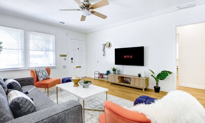 Start your day with golden-hour coffee on the front porch of this peaceful 2-bedroom home in the San Gabriel Valley. Cook breakfast in the full kitchen, relax in the living room with Smart TV and games, or head out to Citrus Crossing, Covina Town Square, or The Huntington Library. With two comfy bedrooms, 2 full baths, fast WiFi, and space to unwind, it’s perfect for families, couples, or work trips. Book your stay today!