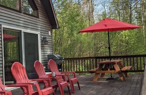 You'll be in the heart of the Adirondacks in this large modern chalet; with a large wrap-around porch, wood burning stove, and kid-heaven loft bedroom. This is the ideal destination for a multi-family getaway to the striking beauty of the North Country!
