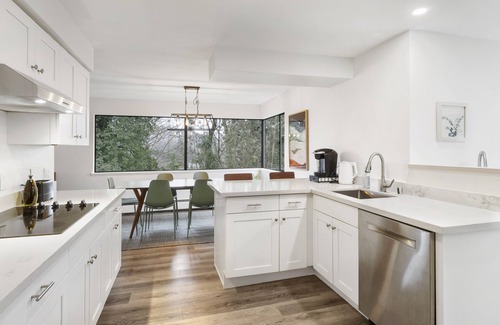 Expansive windows overlook a large green belt with redwood, evergreen and birch trees. Our place feels very tucked away and secluded within a quiet neighborhood. Ideal for families. Stay and enjoy a nice respite from a day exploring Seattle and all the great Pacific Northwest has to offer. LGBTQ-friendly.