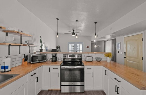 Experience the ultimate in modern living with this newly updated 4 bed, 4 bath duplex, and when you stay at both you get 2 baths and 2 bedrooms per unit with private access and kitchens each! Situated like townhomes great for 2 groups traveling that want to be close. Located in a peaceful neighborhood just a short walk from the University of Arizona's football stadium, this home offers convenience and comfort. The duplex features a sleek and modern design with all the amenities you need. Relax in the spacious living room after a long day or whip up a delicious meal in the updated kitchen. With private parking included, you won't have to worry about finding a parking spot.