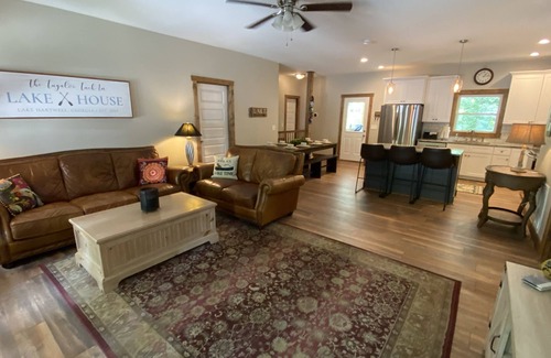 The ‘Tugaloo Tuck-In” lake house is “tucked-in” perfectly on the beautiful Tugaloo River on Lake Hartwell, in a quiet cove around the corner from amazing mountain views and the famous Jumping Rock! Our newly constructed 2-story home can sleep 14 comfortably. With two covered porches, spend your mornings looking out onto the HUGE backyard with lake views, or enjoy your days on the lake with your boat in the private cove with a covered dock, or use the kayaks, paddle-board and floats to swim! The home offers two covered porches with lake-views, hammock and porch swing, a large flat backyard and spacious patio with a fire-pit area. The yard has plenty of room to play yard-games or relax in the sun. Enjoy your days on the lake and store your boat in the private, covered dock - Or feel free to use one of the three Kayaks, Paddle-board or floats! The secluded cove feels like your own private swimming pool and only a five minute kayak ride around the corner from the popular "Jumping Rock", where lake-goers jump in the lake from a 30 foot cliff! Relax at night by the intimate fire-pit underneath the beautiful night sky. Game nights will be a blast in the basement game-room with a NEW arcade game with over 20 classic arcade games including “Mortal Kombat”, a beautiful pool table, an air hockey, and darts - Or enjoy watching your favorite team on one of the 3 Smart TVs. It’s your lake destination get-away at the secluded Tugaloo Tuck-In! Come relax and enjoy the "lake life"!