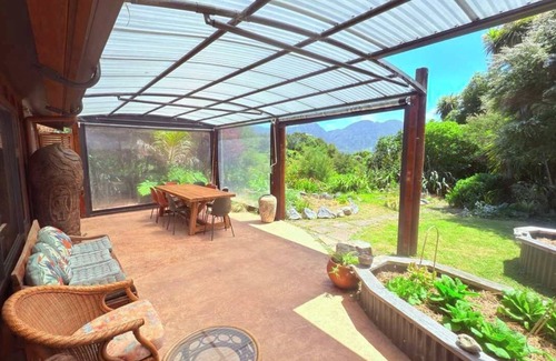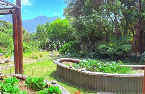 Step outside to explore the expansive gardens, where guests are welcome to harvest fresh vegetables. Enjoy breathtaking views of the sea and surrounding bush from this tranquil setting.