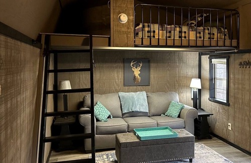 This is a cozy little cabin perfect for enjoying a little relaxation, one room cabin with separate shower house just 30 ft from cabin. Also great as an overflow if you have rented Cabin 3 or Cabin 5. Sleeps 4 guests with a queen bed in a loft and a pull out bed on the ground level.
