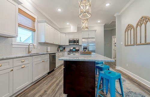 Turquoise Shells is a beautiful coastal home located on the East end of Galveston Island. As you enter the home, you will feel the calmness of the Island from the modern coastal décor. On certain evenings, you can hear the ocean from the rocking chairs on the patio.
