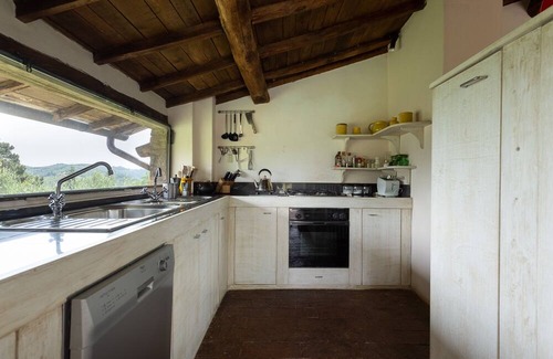 The house has all modern conveniences whilst maintaining its original Tuscan style and charm. There are 2 bedrooms with bathrooms en suite on the lower floor with access directly into the garden. Upstairs there is a very light spacious sitting/dining room with a characteristic Tuscan fireplace. The kitchen is well equipped with a lovely picture window looking out to the surrounding hills. Leading out of the kitchen is a terrace for al fresco eating.