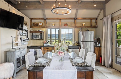 Your amenities include free wi-fi, Fire Stick TV. A complete kitchen with all modern appliances, a wellness pad for your aches and pains, a large dining area with a beautiful classic wood dining table for work or entertaining seating up to 6 people comfortably, a new luxurious king size bed, "Dr's Choice Elite" with adjustable base, ample pillows and bedding, a wall fireplace in bedroom, a cozy couch for relaxing and watching TV that also folds into a double sleeping bed if you have additional guests, a wonderfully spacious spa inspired bathroom with an elegantly tiled shower including an over sized “rain' shower head, a tankless water heater that won't run out of hot water! A washer and dryer for your laundry needs in a separate enclosed room. Air conditioning. All of this is set in a spacious studio layout with magnificent rustic iron lighting fixtures all on dimmers for perfect work and mood settings, and all floors have plush rugs for warmth and comfort. On the exterior surrounding La Cabina are extended gardens, a restored greenhouse, patios for BBQ'S or just relaxing with your favorite beverage taking in the dramatic views. Ever changing incredible sunsets! New, elegant curtains you can draw on main patio, for added room and privacy. Parking is immediately in front of La Cabina, so getting to your vehicle is simply stepping out your door. Also as a back up for any outages La Cabina has a generator.