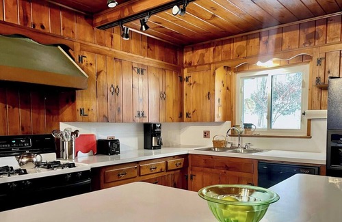 At the heart of the home is a spacious kitchen and dining room where rustic charm meets everyday ease. Natural wood paneling, a large wooden dining table, and soft lighting create a cozy, cabin-like atmosphere perfect for meals and conversation.