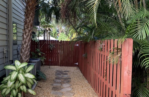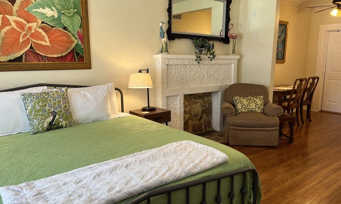 New1-BR Studio, 1st floor of historic home. Beautiful apt. & garden. Kitchenette has all you need -Induction cooktop rather than stove, microwave, toaster oven, water kettle, drip coffee maker, blender, all utensils, dishes, glassware, electric skillet, etc. Large fridge. All linens. Walk-in shower. Hot Tub in screened area in back yard, free use of washers/dryer.s