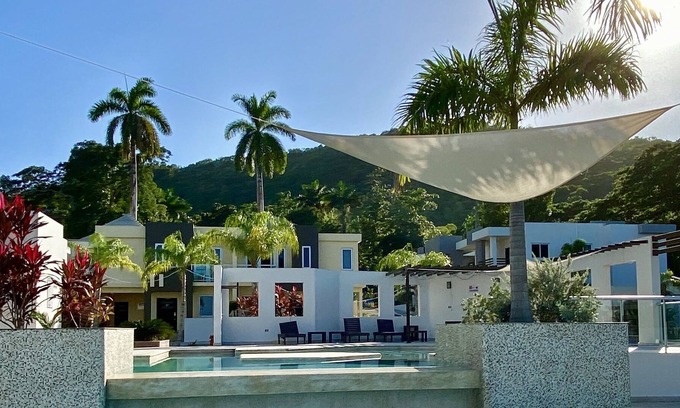This 3 bedrooms unit is over 2100 square feet with modern finishes and open concept living. The interior boast marble staircase which takes you to the upper floor which is complete with 2 bedrooms each with en-suite bathrooms and private balcony, the master bathroom boast double sinks, large walk in closet, shower and jetted tub. The entry-level features, one bedroom, one bath, a spacious family room which features a 48” SMART LED TV with comfortable seating for the entire family to spend time enjoying each other while watching their favorite shows. Cable TV stations are available for a wide range of international channels. The dining room seats six. Other amenities are, state of the art swimming pool, thermal controlled hot tub with mountain and sea views a perfect spot for morning coffee or before-dinner drinks. Air-conditioned and fully equipped Gym, 24 hours gated and guarded community, kids playground, solar water heater, and water tank. Washer and dryer units for your convenience, plush linens, towels and fully stock kitchen supplies, free WIFI and air conditions in all rooms.