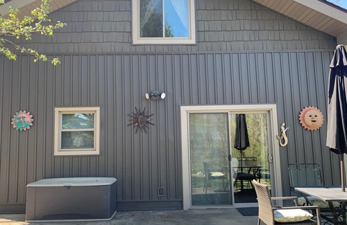 Its located in the country but not far from town. Its really a nice peaceful place to relax on the patio facing the pond with a beautiful waterfall. Theres a dock on the pond with chairs umbrella table. You can do yoga, meditate, swim have a cocktail have fun and relax. Lots of wild life to watch. Many local fine dining to authentic Mexican drive up. Explore the beautiful sights in Southern Illinois.Also centrally located for hiking and wineries galore.