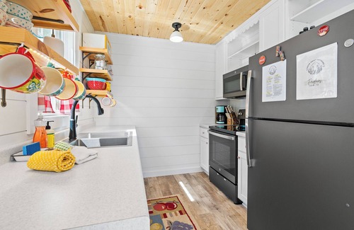 The red cottage is designed with classic coziness and togetherness in mind. There's a beautiful woodstove to enjoy in the fall and winter and the little loft area is perfect for a reader, writer or napper in your midst! There's a work table and lamp if you need a fresh work space.