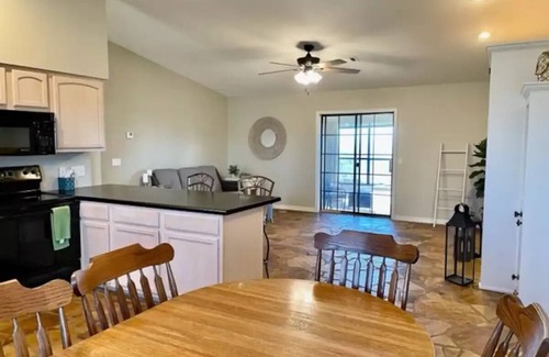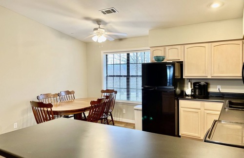 Each bedroom features a queen size bed and closet for storage. The living area includes a sofa sleeper for additional guests. A queen size air mattress is also provided with extra linens. Enjoy the fully stocked kitchen and seating for 6. The kitchen incudes a drip coffee maker for the coffee lovers. Relax in the sunroom and enjoy the scenery of the River Valley. The house also has a two-car garage and a gas grill. A washer and dryer sit in the laundry room for use. The bathroom includes a shower/tub combo and towels are provided.
