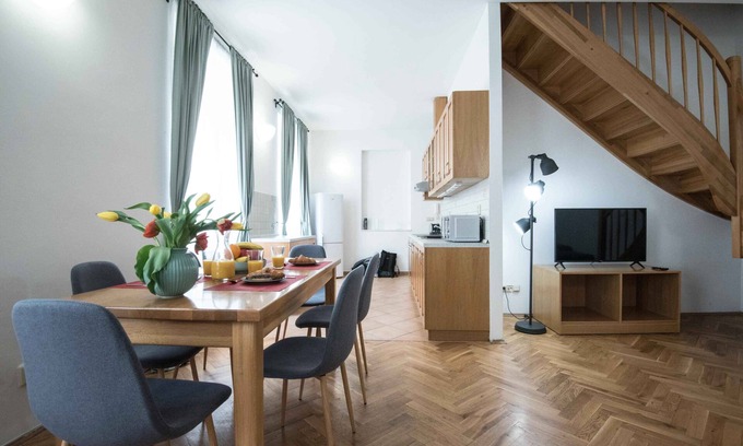 Two Bedroom duplex Apartment in the first floor with spacious living room, bathroom and kitchen is located in Prague 1. Two Bedroom duplex Apartment in the first floor with spacious living room, bathroom and kitchen provides accommodation, featuring Security/Safety, Bedding/Linens, Wellness Facilities, among other amenities. This Apartment features Security/Safety, Bedding/Linens, Wellness Facilities, to make your stay a comfortable one.