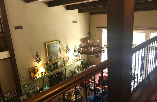 The Red & Blue Suite is the only one upstairs in this wing of the house and overlooks the cathedral ceilinged Great Room, where there is a Grand Piano available for anyone to play.