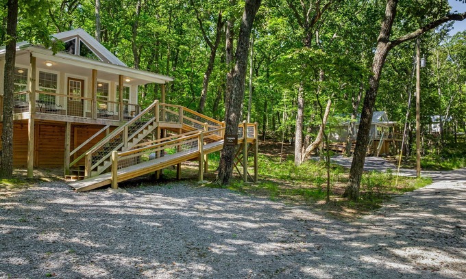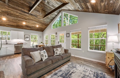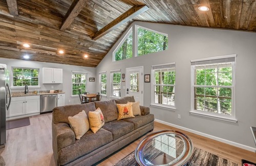 Your family will appreciate the beautiful treehouse views from the covered porch area of each cabin. The porches make a great place to enjoy a cup of coffee or hot tea in the morning and take in the views :) Stepping inside these cabins, you will know your peaceful retreat has begun as you are surrounded by windows that reveal refreshing views through a canopy of trees. Be sure to look up and notice the beautiful wood ceiling that was built by the homeowners and upcycled from hurricane-weathered wood planks on Alabama's own coast in Baldwin County.