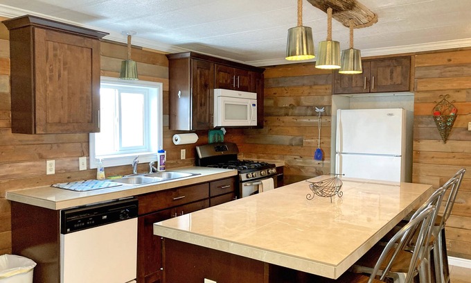 • This property features 2 homes and is perfect for larger groups. Sleeps 20 in beds, 8 on sofa beds and an air mattress for 2. Upper cabin has RV hookups and parking for up to 10 vehicles. The kitchens are fully equipped for meal prep and serving.