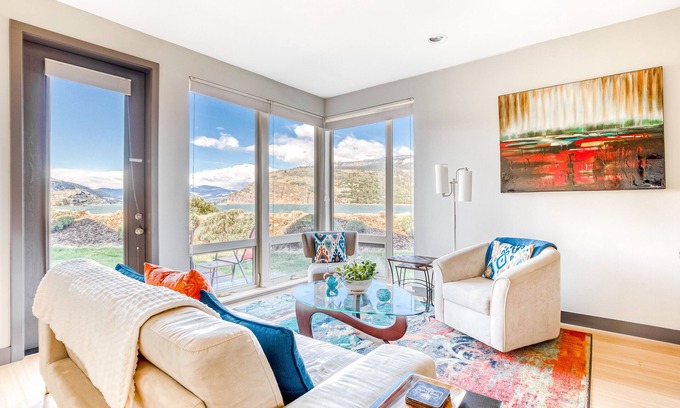 An incredible, open view of the Columbia River and the foothills of the Cascades awaits at this contemporary, two-level condo in Mosier. It's a spectacular scene - especially at sunset - that you can take in from the living room, the main bedroom, the patio, and the upstairs balcony.