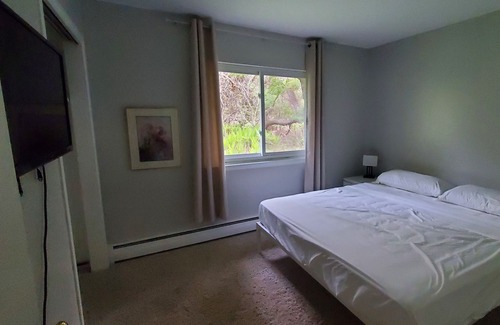 The house includes 3 bedrooms, two with queen size beds and televisions, and one room with a full size bed. The house has a large eat-in kitchen with updated appliances as well as a washer and dryer for added convenience.