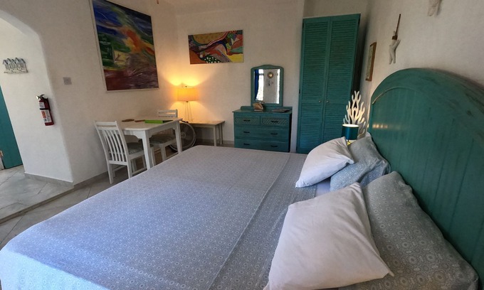 The Two Palms Apartment takes the name from two tall and old Coconut Palm Trees right in front of it. The living area has a 2 single beds (which can prepared as double king size bed), bed linen of high quality cotton, 2 bedside tables with lamps, wardrobe, drawers, safe, a fully equipped kitchen with all the necessary: 4 gas burner stove with oven, refrigerator, freezer, sink, cabinets with Italian coffee machine, american coffee maker , toaster, cutlery, dishes, glasses, pots, etc; the bathroom has sink, toilet and a large shower. At the the entrance of the Apartment there is a wonderful covered patio with , table, chairs, sunbed, hammock and the garden with lawn on two sides around. There are also 110 volt sockets (with American system) and European sockets with 220 volt. The apartment has a big parking area just next to it. The property has an outdoor shower, cloth lines, hoses and a very well maintained garden with lawn, coconut palm trees and beautiful flowers.