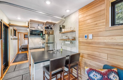 Inside, guests will find a practical and comfortable open floor plan with integrated kitchen, dining, and living areas, with plenty of room for entertaining or relaxing with friends and family. The kitchen includes a two-burner stove top, convection microwave, and dishwasher. The home has radiant heat throughout with individual thermostats in each room for that added level of personal comfort.