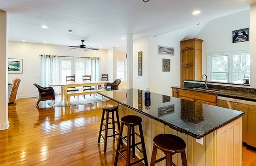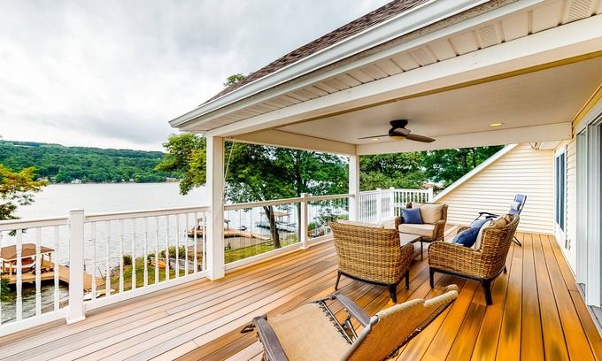 Get ready to experience a truly unforgettable vacation in the Finger Lakes at Keuka Lake Retreat! This two-story retreat offers guests nothing but comfort, incredible amenities, and a lakefront location that will marvel all your guests. On the lower and main level, you'll find yourself surrounded by an elegant and subtle interior decor with tasteful wood accents throughout. Large windows will let you all enjoy Keuka Lake views. An open floor plan combines the kitchen, living room, and dining area together. Take advantage of the fully-equipped kitchen to prepare memorable, full-course meals or quick snacks on the go–gorgeous granite countertops and modern appliances will make cooking a breeze. You can find two dining tables with space up to six people each (12 in total). Grab any of the board games available and bring them to the living room for a fun afternoon full of laughs. If you start feeling a little bit cold, the gas fireplace will warm up the place in the blink of an eye. Right off the living room and dining area is the access to the large deck where you'll find a gas fireplace and a picnic table, the perfect setting for a cookout. On this level, you'll also come across one bedroom with a queen bed and one ensuite bathroom. As you climb up the stairs, four more bedrooms and two ensuite bathrooms can be found. Three bedrooms feature a queen bed each and the other one has two twin beds. The deck on the second floor offers guests the chance to wind down in a lakefront seating area