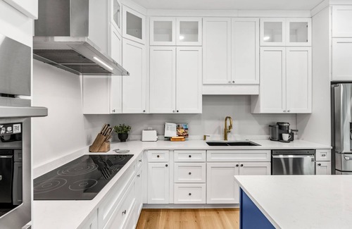 Fully equipped kitchens with quartz countertops and premium stainless steel appliances
