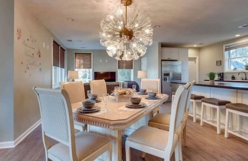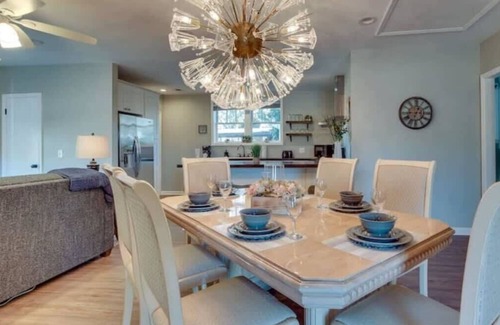 As you pull up to the home, you will park and enter the main entrance to the home. Entering the main door of the house will bring you into the fully updated kitchen with new shaker style cabinets, all necessary appliances including a refrigerator, dishwasher, microwave, toaster, coffee maker, oven, stove with overhead range hood, and all the essentials needed for preparing and serving meals at home. The kitchen has four stools at the bar, and an eat-in dining area, which is open concept to the living area. This open concept is perfect for entertaining and socializing with the entire family. The living area has a sofa bed, coffee table, end tables and lamps with a 50" Roku TV. High end finishes throughout the home will satisfy even the most discerning guests, with original terrazzo floors and spa-worthy floor-to-ceiling tiled walk-in showers. The very spacious master bedroom has a king bed, nightstands with lamps, and a small bench at the foot of the bed. The second bedroom is furnished with a queen bed, nightstands, lamps, and a luggage rack, the third bedroom has two twin beds with a shared nightstand and lamp and larger closet. The studio apartment is a tastefully converted and fully finished former garage, and is furnished with a small kitchenette with microwave and kitchen essentials, a queen bed, and two pull out sofa beds.